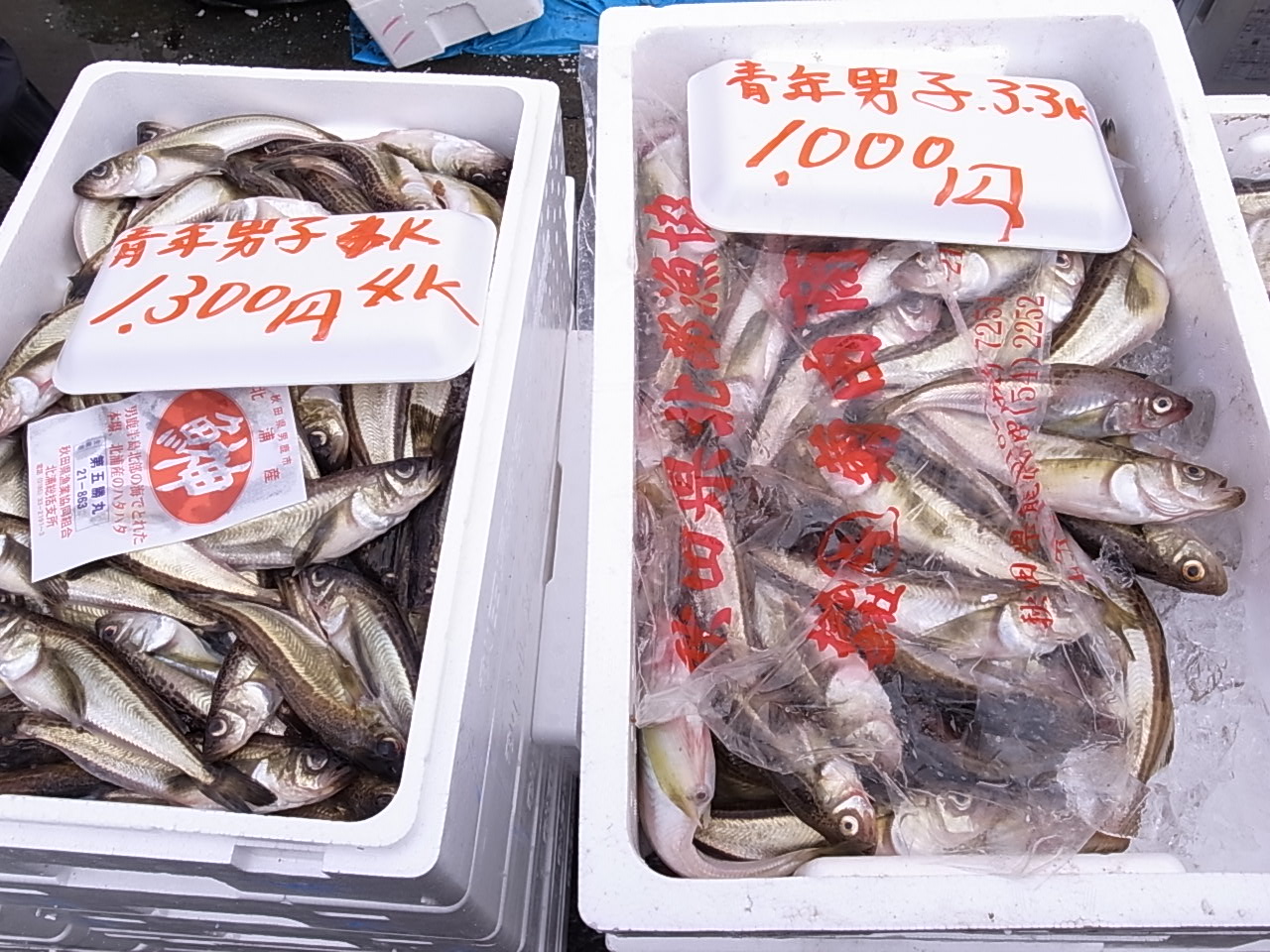 本格的な魚屋さんもあり。「ざる」とはイルカの肉という噂。「成人女子」とは卵を持ったメスのハタハタのこと。