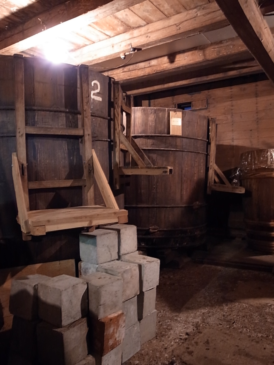 醤油の麹室です。床に穴があいています。ここに炭を入れ稲藁を敷き、火をつけて麹室を保温。これを「埋火(うずみび)」というそうです。醤油の仕込みは2月から、今は準備中。家付き酵母で発酵させています。