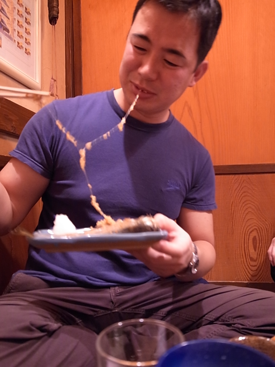 ほ〜っ。楽しい。そそられるお品書き。ですが浅野さん、メニューなんか見ません。「だまこもち鍋と、漬物盛り合わせ、ギバサ、イカの刺身…」とするすると注文。2008年のブログを見たら、ほぼ同じメニューだった!