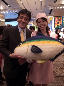フェルトで出来たブリのぬいぐるみを持ったミス富山ブリ嬢です。佐藤としひろさんとパチリ。