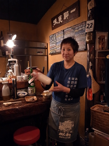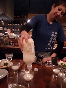 昨晩、秋田市手形の「おもろ」さんにて。ナゾの白い液体をいただく。冷凍品なのでシェイクして解凍する明子さんの図。背後に心配そうに見守る和彦さん!?