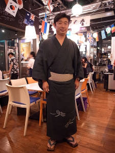 (左)中尾彬じゃなくて越七の藤井さん。(右)とんぼの絵柄を絞りであつらえた浴衣で登場の泉橋酒造の橋場さん。
