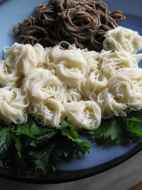 おそうめん。丸本酒造のある鴨方町はそうめんの町なのです。後ろの黒いのはひじきそうめん。お米は丸本酒造の田んぼでとれた山田錦。うま味のあるおいしいお米! 2008年稲刈りの時は酵素玄米でいただきました。