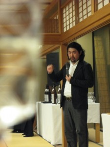 木村硝子店の麻原彰晃!?さんがグラスの説明を。テーブルは「最後の晩餐」風ロング。