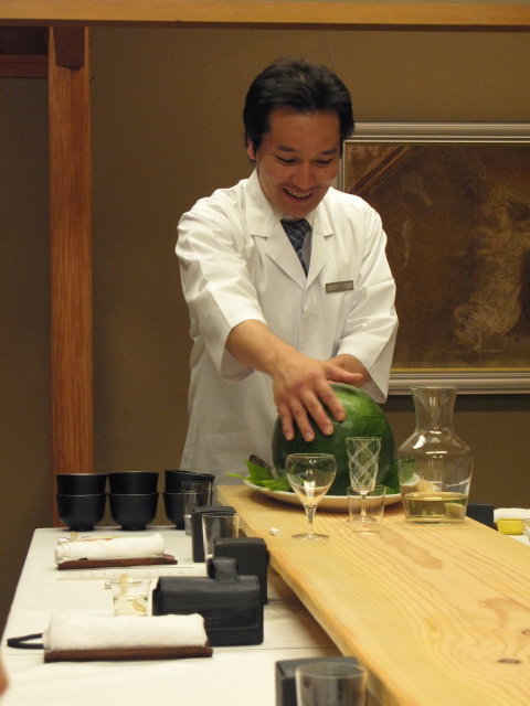 先ほどの汁が入った冬瓜の皿を持ってみたら想像以上に重くてビックリ。 (右)「丈径」をお燗で。