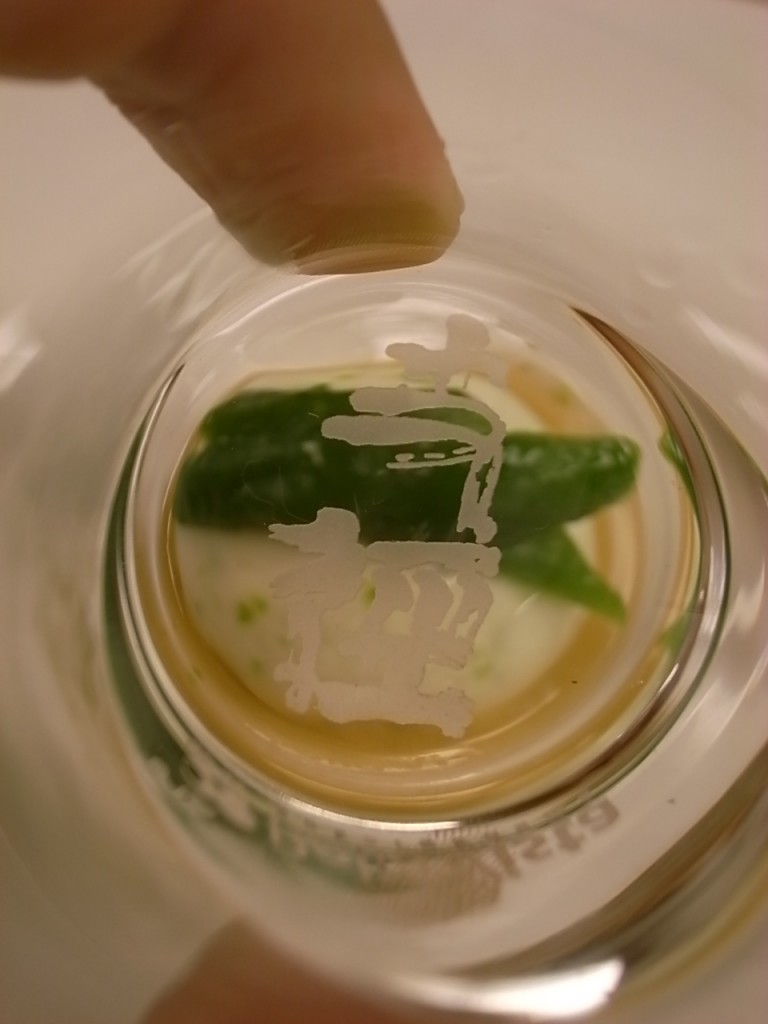 木村硝子店のうすはりグラス。特注「丈径」の文字入り! このうすはりは杜氏・丈径さんにとって欠かせないグラス。すべてのお酒をこのうすはりでティスティングするといいます。